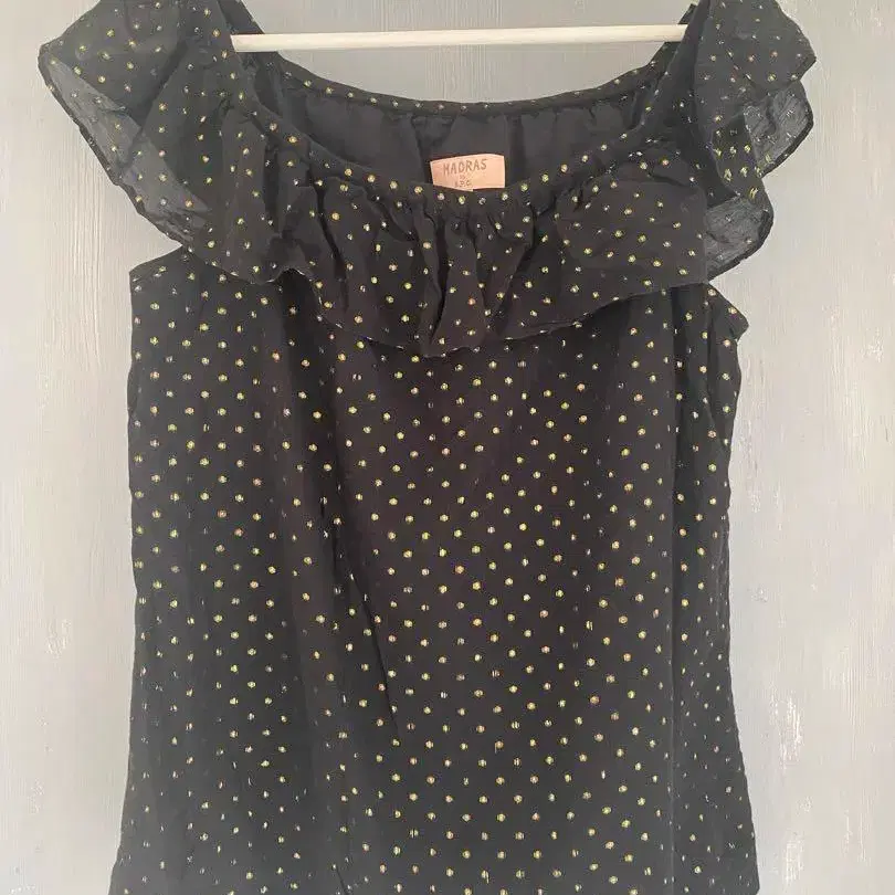 블랙에 골드 도트 무늬의 슬리브리스 탑, 프릴이 달린 엘레강트한 디자인. - 브랜드: MADRAS by A.P.C. - 컬러: 블랙 - 디자인: 도트 무늬 - 스타일: 슬리브리스 - 프릴: 프릴 방문해 주셔서 감사합니다