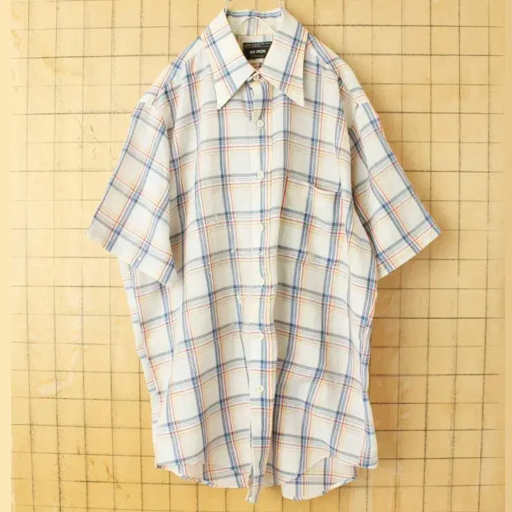 70s 80s USA JCPenney 반팔 체크 셔츠 블루 L ss26
