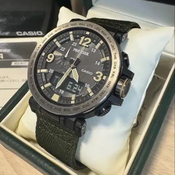 CASIO PRO TREK의 블랙과 그린 디자인, 솔라 충전, 나일론 밴딩으로 아웃도어에 적합합니다. - 브랜드: CASIO - 모델명: PRO TREK - 색상: 블랙/그린 - 부속품: 상자, 설명서 - 밴딩 소재: 나일론 【상품 설명】 주로 등산에 사용했지만, 다른 시계를 메인으로 사용하고 있어 판매합니다. 등산, 캠핑 등에 적합한 모델로, 방위, 기압, 고도계 등의 기능도 정상적으로 작동합니다. 【상태】 ・화면, 베젤에 눈에 띄는 흠집 없음 ・밴딩에 약간의 사용감 있음 ・작동 확인 완료 (※사진을 확인하시기 바랍니다) 【기타】 중고품이므로, 이해하시는 분만 구매하시기 바랍니다. 즉시 구매 OK/댓글도 부담 없이 남겨 주세요! 색상···카키 계열 부속물···상자, 보증서 작동···양호