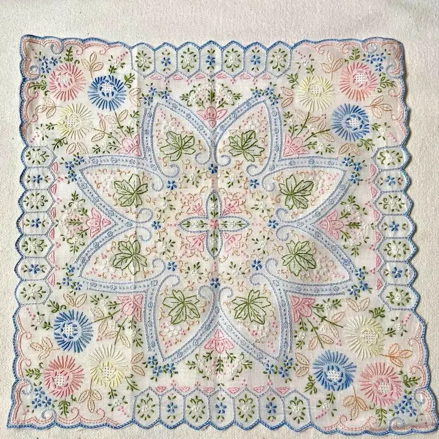 미사용 산터우 SWATOW 고져스 자수 손수건 꽃무늬 보타니컬 계열 컬러