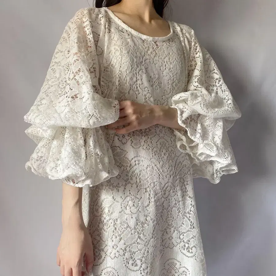 vintage 화이트 전체 레이스 프릴 소매 원피스