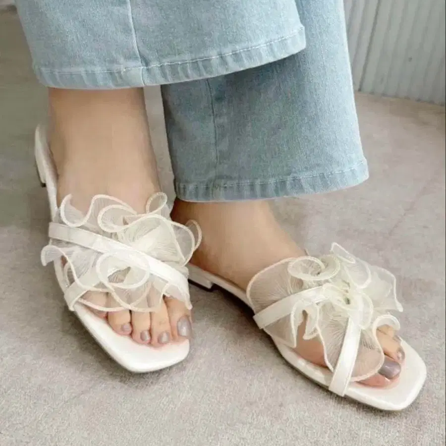 NICE CLAUP 화이트 리본 포함 오간자 프릴 플랫 샌들 M