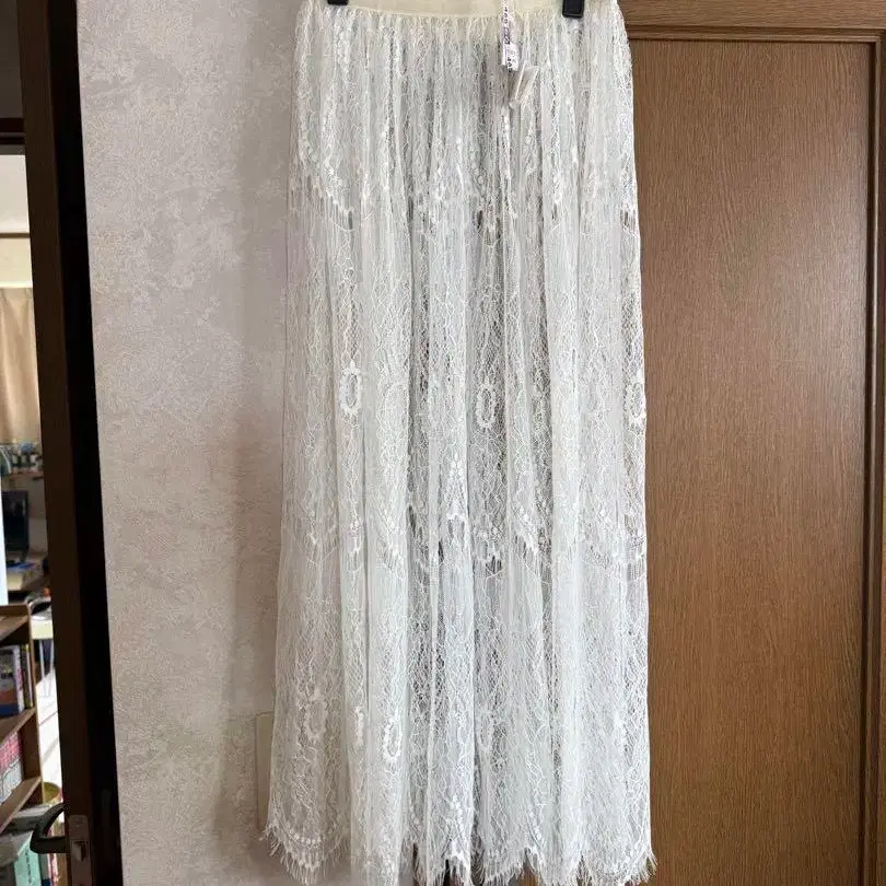 자동 번역되었어요. 원문보기투명한 레이스 디자인의 화이트 롱 스커트.