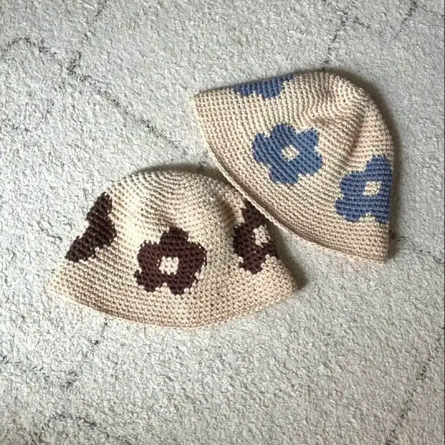 손뜨개질 버킷햇 꽃무늬 블루 코튼