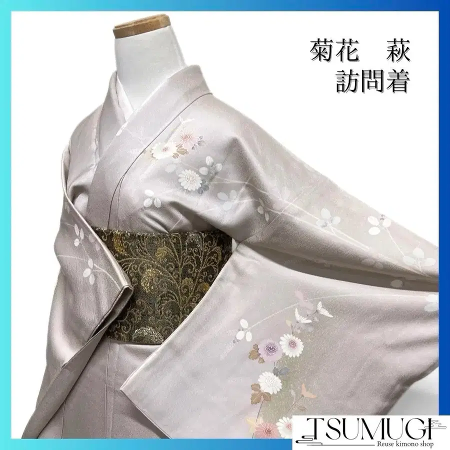사야가타 지문이 있는 탁한 아주 옅은 퍼플 색 바탕에 국화와 억새 문양이 그려진 화려한 디자인의 옷입니다.