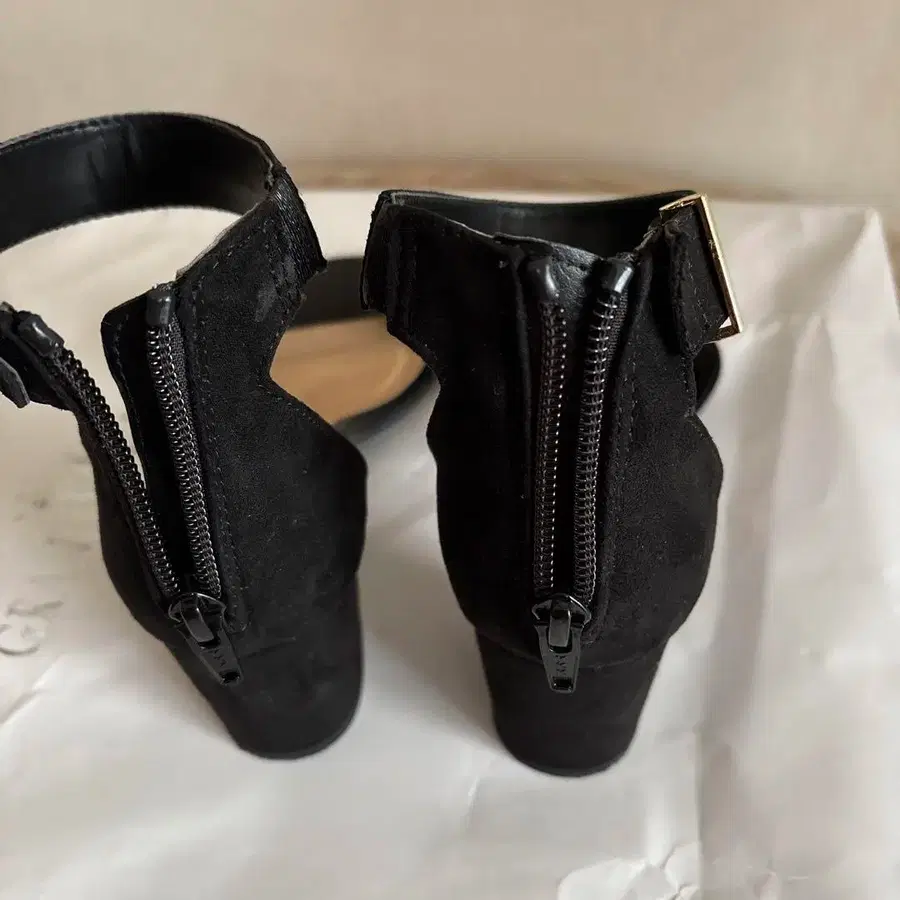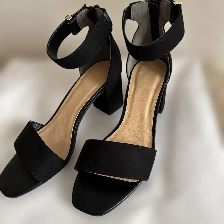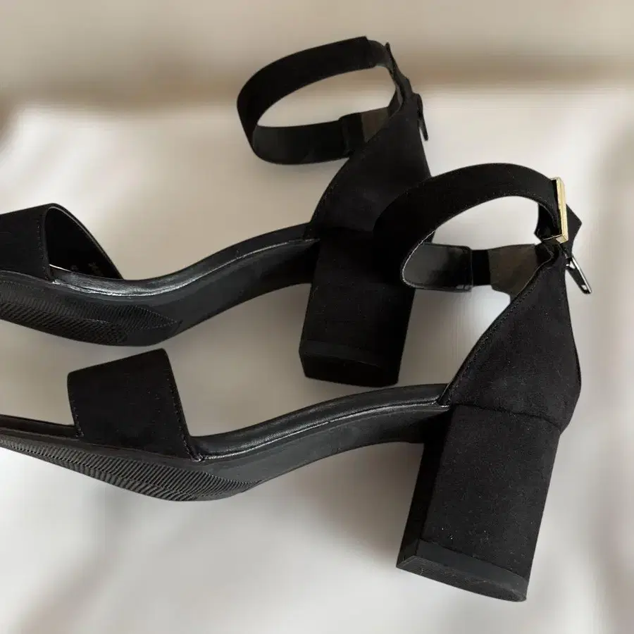 스웨이드 느낌의 블랙 샌들, 앵클 스트랩과 뒷면 지퍼가 스타일리시한 디자인. - 색상: 블랙 - 디자인: 앵클 스트랩 - 힐 높이: 미들 힐 - 지퍼: 뒷면 지퍼 - 소재: 스웨이드 느낌 방문해 주셔서 감사합니다. 컬러···블랙 계열 얼룩, 찢김, 냄새 등···없음