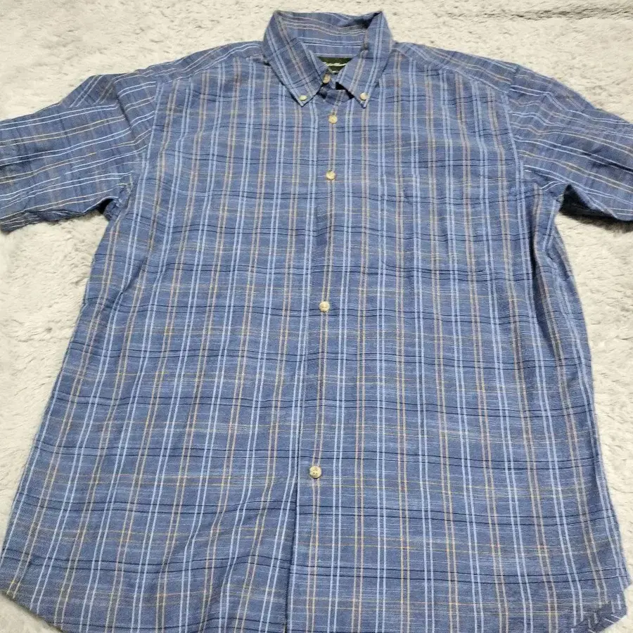 자동 번역되었어요. 원문보기Eddie Bauer의 블루 계열 체크 무늬 버튼 다운 반팔 셔츠.