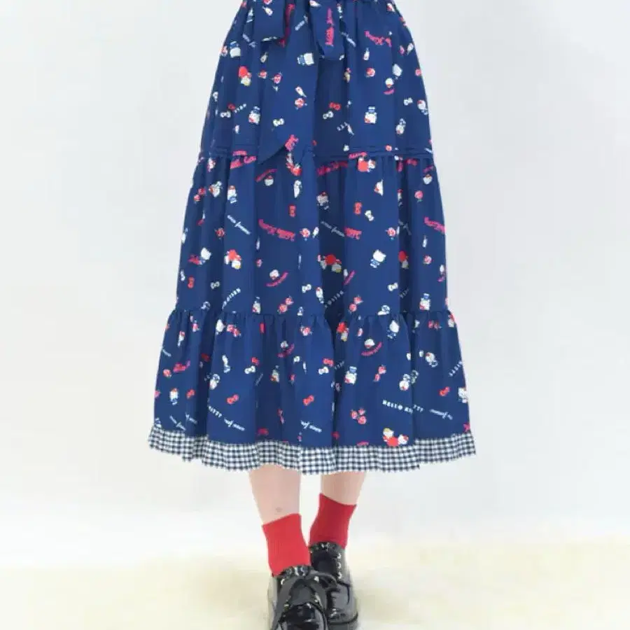 봉투에 담긴 새상품입니다. 액시즈 헬로키티 프린트가 들어간 네이비 색상의 티어드 롱 스커트입니다. 리본 포함 허리와 체리 참이 특징입니다. - 색상: 네이비 - 디자인: 헬로키티 프린트 - 스타일: 캉캉 스커트 - 길이: 롱 - 장식: 리본 포함 허리 - 특징: 체리 참 포함