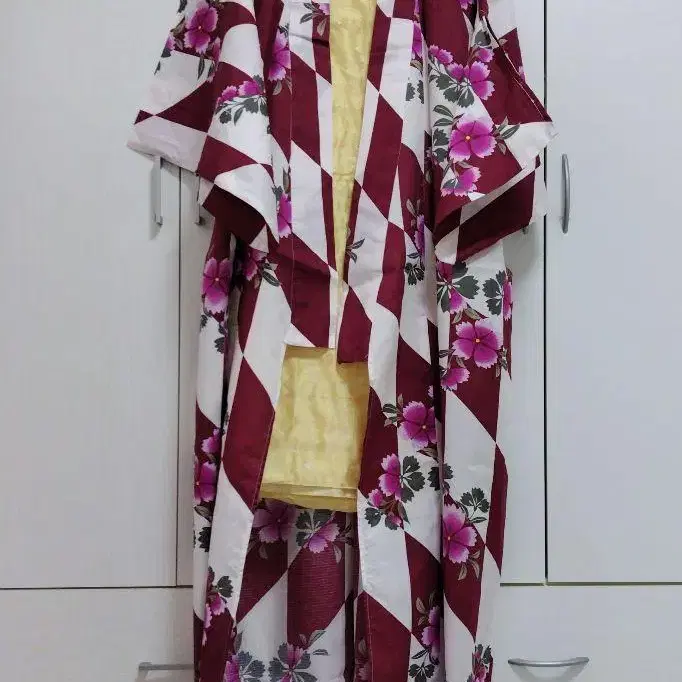 빨간색과 흰색의 다이아몬드 패턴에 꽃무늬가 들어간 유카타와 오비 세트. - 색상: 빨간색과 흰색 다이아몬드 패턴 - 소재: 면 또는 폴리에스테르 - 장식: 꽃 무늬 프린트 - 스타일: 유카타・오비 세트 - 노란색 오비 또는 보라색 오비 중 선택하실 수 있습니다. - 오비는 양면으로 사용하실 수 있습니다. - 뒷면에 약간의 얼룩이 있습니다. - 유카타와 오비를 직접 코디네이트 해보세요(^_^) 방문해 주셔서 감사합니다.