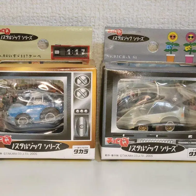 쵸로 Q 노스탤지어 시리즈 2005 No.04 이스즈 117 쿠페 No.03 CR-X Si 둘 다 미개봉 새상품으로 상자와 쵸로 Q(타이어 포함)에 손상은 없지만, 안의 투명 플라스틱이 수축되어 있습니다. 걱정되시는 분은 개봉하여 탈부착한 후 다른 플라스틱 판 등으로 보호하시기 바랍니다. 댓글 없이 즉시 구매도 가능합니다.