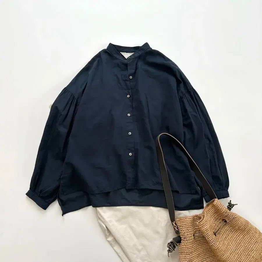 긴팔 네이비 紺 볼륨 소매 밴드 카라