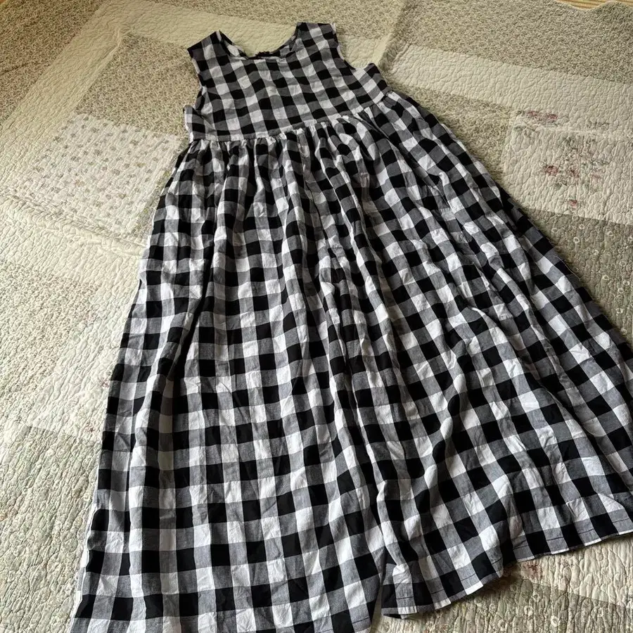 블랙과 화이트의 체크 무늬 슬리브리스 맥시 드레스, 가벼운 소재로 착용감이 쾌적합니다.