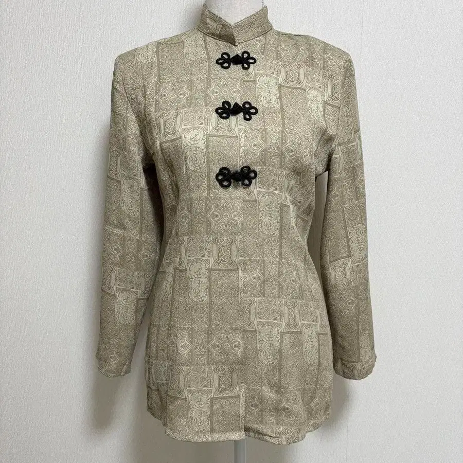복잡한 무늬와 패턴이 원단에 짜여진 자카드와 같은 원단의 약간 두꺼운 차이나풍 블라우스입니다.