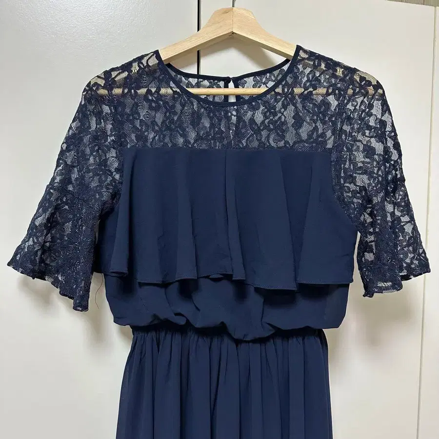 레이스와 프릴이 특징인 원피스입니다. 올해 2월에 결혼식에서 한 번 착용하고 보관하고 있었습니다. 색상: 네이비 레이스 부분은 사진으로는 잘 모르실 수도 있지만, 라메가 들어 있어 반짝반짝 빛납니다. 사진 ②: 앞 사진 ③: 이후 ★접어서 방수 봉투 + 상자에 넣어 발송합니다. 신장 158cm에 펌프스(힐 포함)를 신으면 발목이 살짝 보일 정도였습니다. 허리는 밴딩으로 되어 있어 넉넉하게 입을 수 있습니다. 결혼식 드레스 원피스 마터니티 드레스 색상···네이비 계열 무늬···꽃무늬 계절···봄, 여름 얼룩, 찢김, 냄새 등···없음