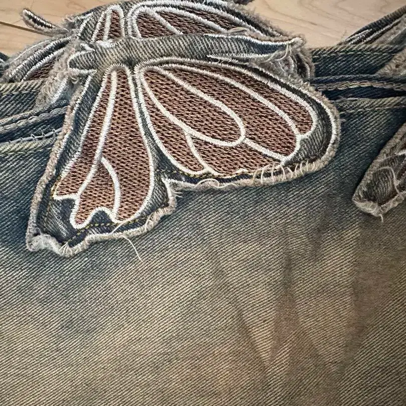 나비 자수가 특징적인 그라데이션 데님 팬츠. - 디자인: 나비 자수가 들어간 데님 - 색상: 그라데이션 데님 (밝은 파랑에서 다크 블루) - 스타일: 캐주얼 방문해 주셔서 감사합니다.