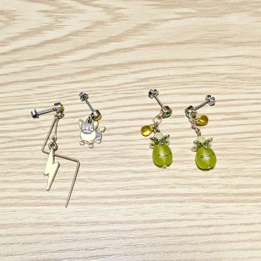 포켓몬의 미니브, 왐파치의 귀걸이 세트입니다. 둘 다 몇 번 사용했습니다. 얼룩이나 녹은 없지만, 중고품임을 양해하신 후 구매해주세요. 즉시 구매 환영. 낱개 판매 불가.