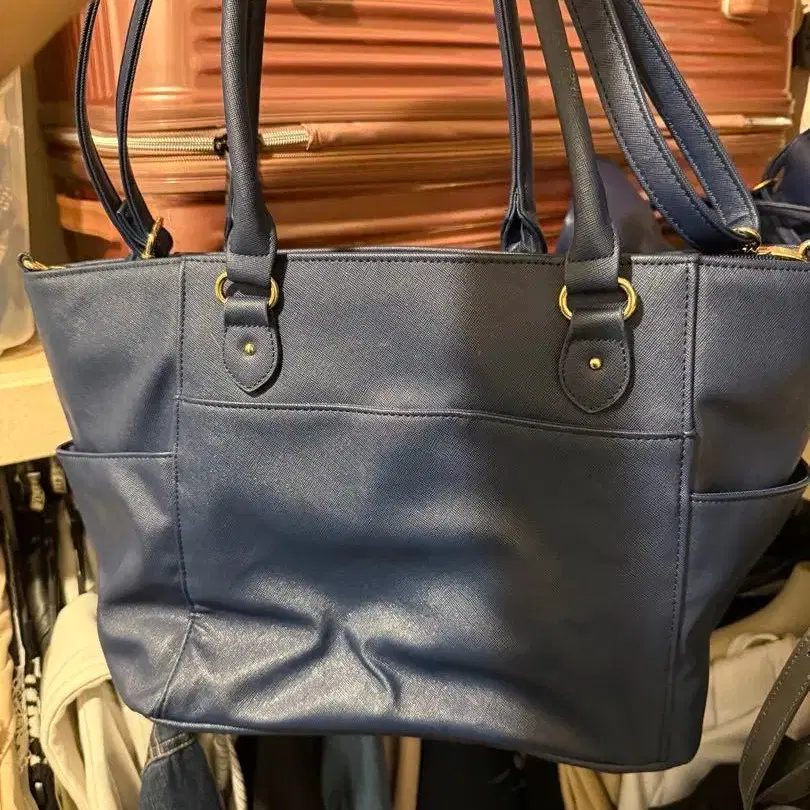 네이비 색상의 합성 피혁 토트백으로, 외부에 지퍼 포켓, 내부에 포켓이 부착되어 있습니다. - 색상: 네이비 - 소재: 합성 피혁 - 포켓: 외부 지퍼 포켓 있음 - 안쪽: 내부 포켓 있음 1회만 사용했습니다. 방문해 주셔서 감사합니다.