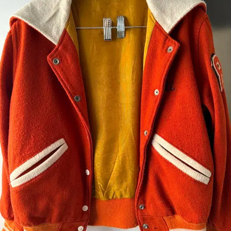 오렌지 컬러의 울풍 바시티 자켓, 후드 부착, Slicers 자수 장식. 여성용으로 구입했지만 남성용으로도 전혀 문제 없습니다! 뒷면의 후드가 조절 가능해서 패션에 따라 변화시키는 것도 재미있을 것 같습니다. 오래된 제품이라 후드의 척이 조금 움직이기 어렵다는 점은 양해 부탁드립니다. 사이즈는 기재되어 있지 않지만, 키 172cm인 제가 입으면 허리 위까지 오는 짧은 바시티 자켓입니다. 참고로 - 색상: 오렌지 - 안감 색상: 옐로우 컬러 - 디자인: Slicers 자수 - 후드: 후드 부착 - 소매 디자인: 스트라이프 - 소재: 울풍 원단 방문해 주셔서 감사합니다.