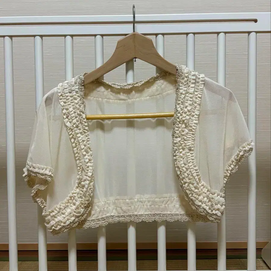 프릴이 달린 시스루 볼레로 반팔 크림색 가디건