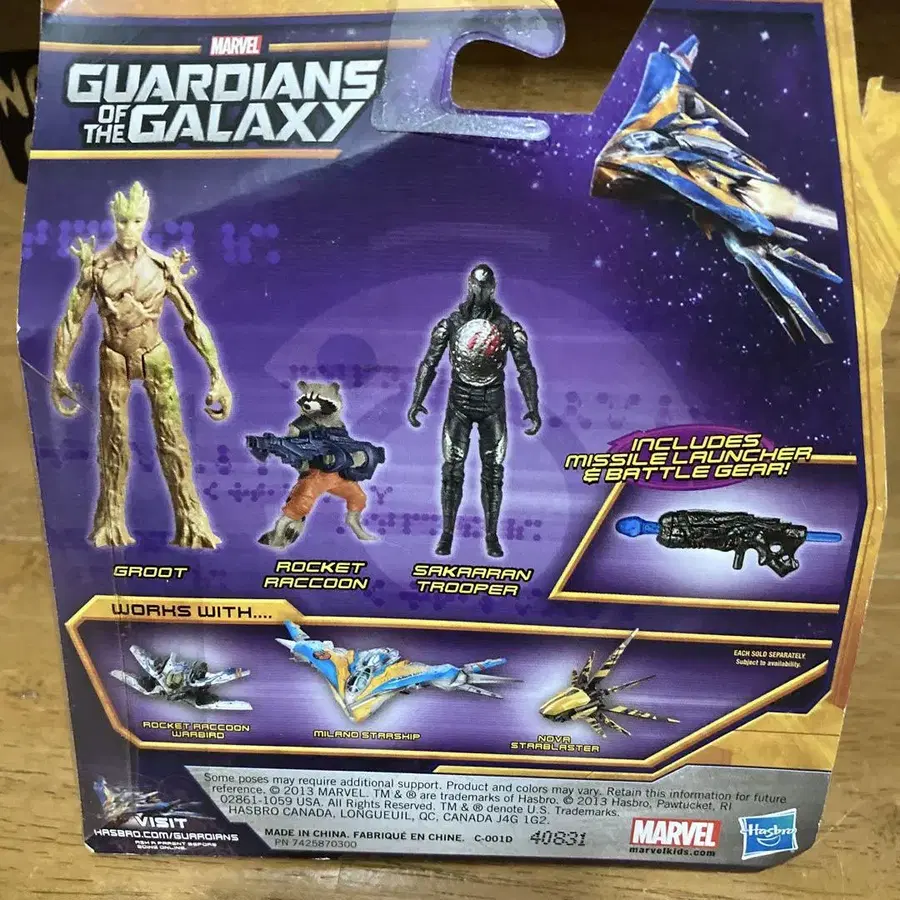 가디언즈 오브 더 갤럭시 피규어 세트. 그루트, 로켓 라쿤, 사카란 트루퍼가 포함되어 있으며, 미사일 런처가 포함되어 있습니다. - 캐릭터: 그루트 - 캐릭터: 로켓 라쿤 - 캐릭터: 사카란 트루퍼 - 부속품: 미사일 런처 - 시리즈 명: 가디언즈 오브 더 갤럭시 방문해 주셔서 감사합니다.