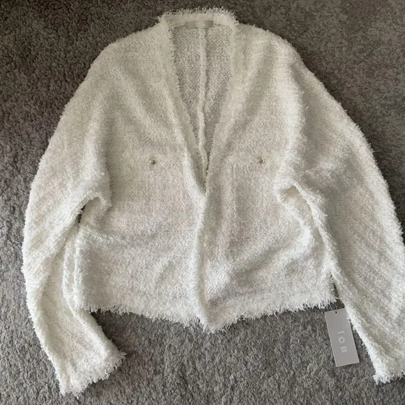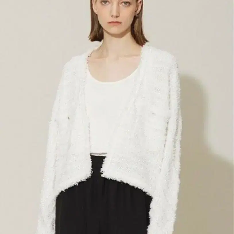 보송보송한 텍스처의 화이트 가디건, 오픈 프론트 디자인으로 스타일리시합니다.