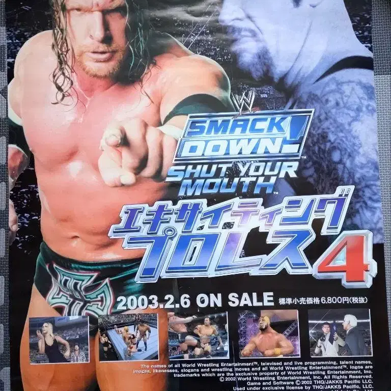 플레이스테이션 2 익사이팅 프로레슬링 포스터입니다. HHH와 언더테이커 HHH의 근육은 멋지네요. 매장에서 전시되었던 것이므로 핀 자국이 있습니다. 가장자리에 마찰도 있습니다. 사용감이 있지만 깨끗한 편이라고 생각합니다. 판매 중인 다른 한 장(익사이팅 프로레슬링 4)과 세트로 구매하시면 2장 8000엔에서 3000엔 할인된 5000엔에 판매합니다. 확인만 함 즉시 구매 가능