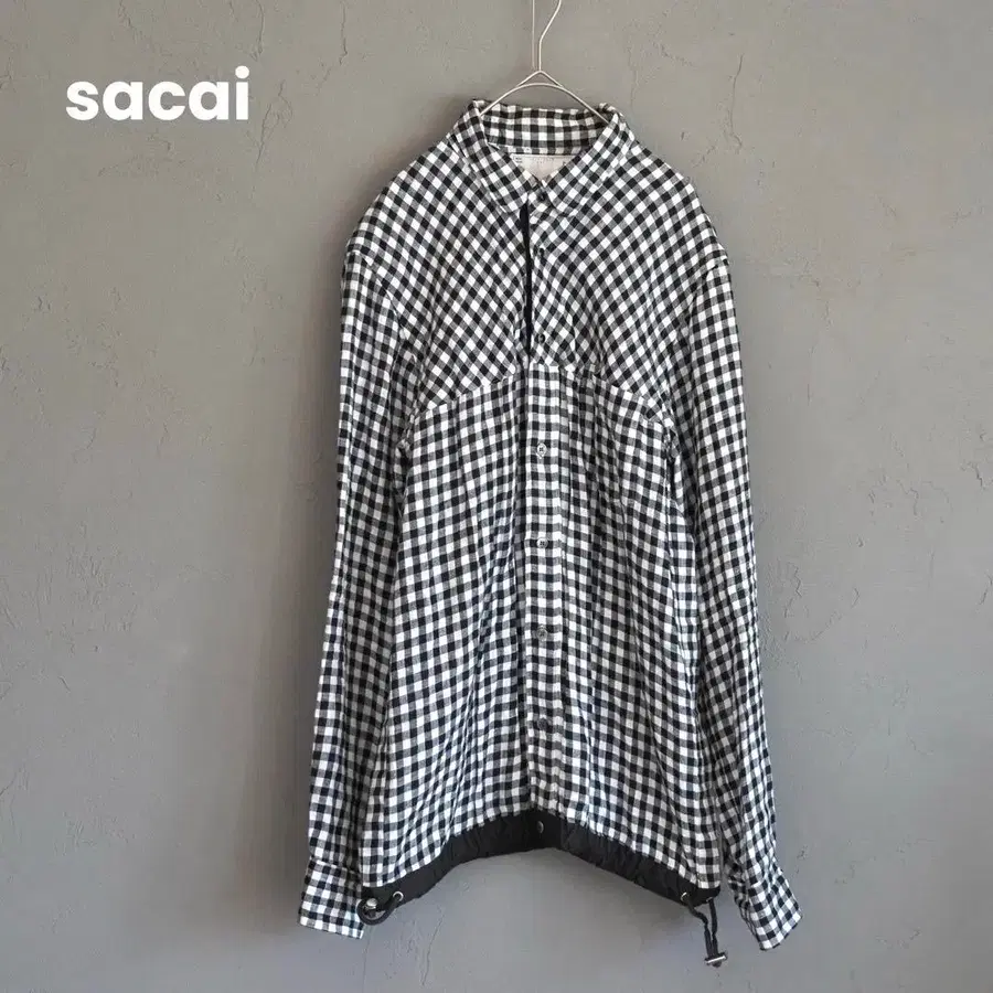 sacai다운 구축적인 디자인의 16ss sacai 드로 코드 깅엄 체크 셔츠입니다. 모노톤의 깅엄 체크 패턴으로, 가슴 부분에서 절개된 독특한 커팅. 밑단에 드로 코드가 있어 실루엣 조정이 가능합니다.