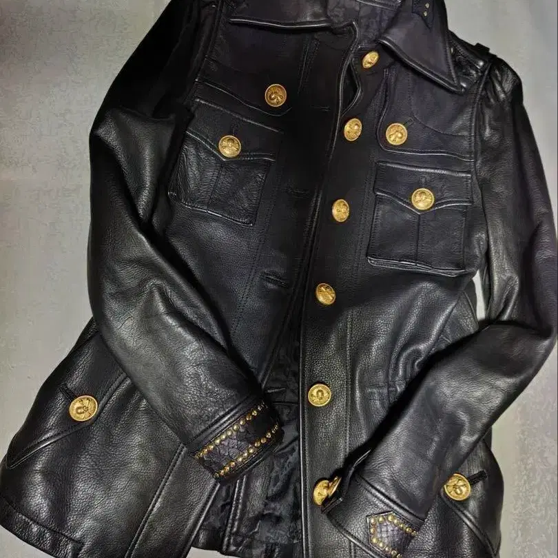 Roen 가죽 자켓 구매 당시 1회 사용 후 클리닝하여 자택 보관. 어깨 견장과 골드 컬러 버튼이 특징인 블랙 가죽 코트. - 색상: 블랙 - 소재: 가죽 - 버튼 색상: 골드 컬러 - 디자인: 견장 부착, 포켓 부착 - 안감 색상: 블랙 자택 보관에 이해가 있으신 분만 부탁드립니다.
