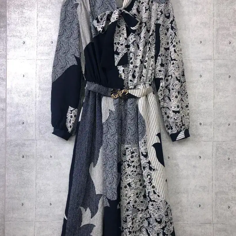 쇼와 레트로 부케 일본산 구제 의류 올 패턴 허리 벨트 리본 타이 원피스
