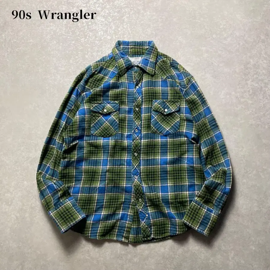 인기 브랜드 Wrangler의 90년대 제작 웨스턴 셔츠. 브랜드 특유의 웨스턴 요크와 스냅 버튼이 포인트입니다.