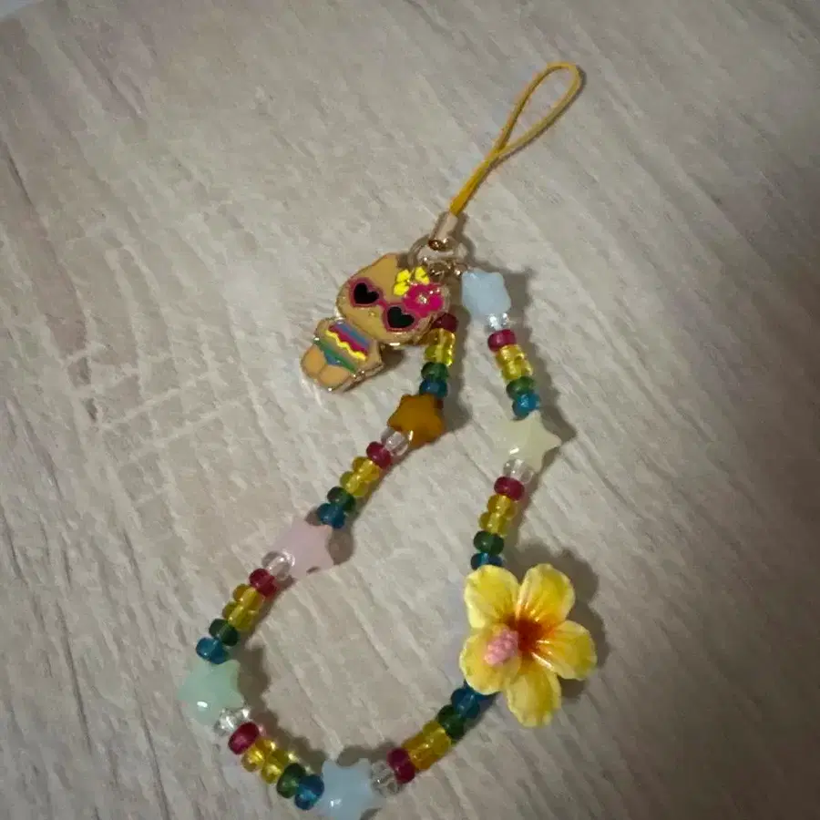 컬러풀한 비즈와 꽃 모티브가 특징인 스트랩. - 디자인: 컬러풀한 비즈와 꽃 모티브 - 캐릭터: 큐트한 캐릭터 참 - 소재: 플라스틱 비즈와 꽃 - 색상: 다채로운 색상 (핑크, 옐로우 컬러, 파랑 등) - 용도: 스트랩으로 사용 가능 택 없음 새상품 방문해 주셔서 감사합니다.