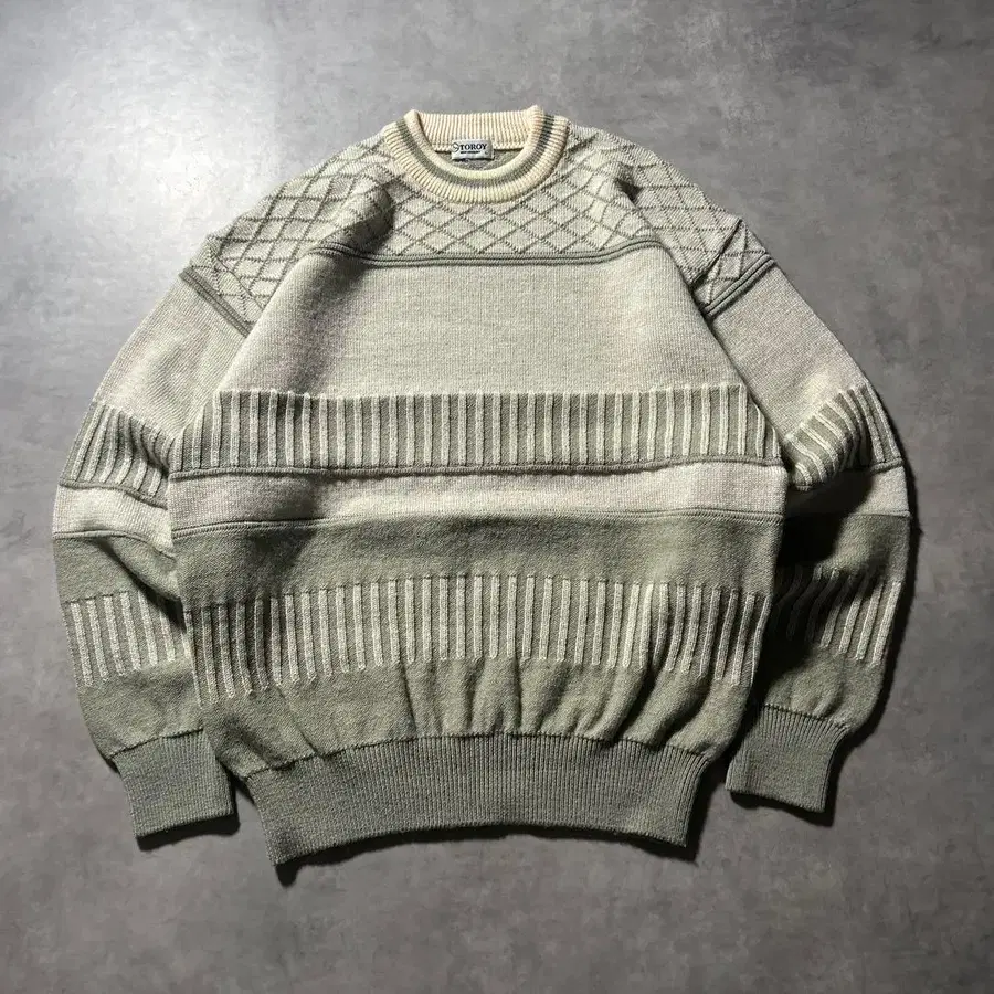 TOROY 빈티지 두꺼운 그린 베이지 보더 스트라이프 니트