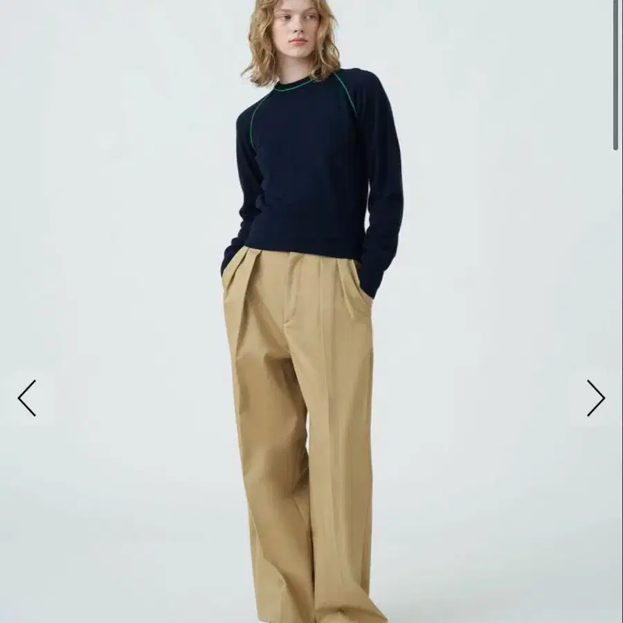 팬츠는 남성용 트라우저를 이미지한 2턱 디자인에 자연스럽게 퍼지는 와이드 실루엣으로 캐주얼하지 않은 성숙한 밸런스를 연출합니다.