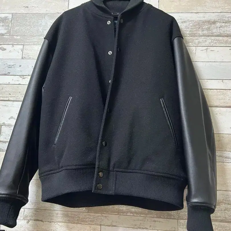 방문해 주셔서 감사합니다. right-on에서 구매한 울과 가죽 콤비네이션으로 스타일리시한 바시티 자켓입니다. 한 번 걸친 정도이며 얼룩은 없습니다. 거의 새상품입니다. 트렌드에 맞는 기장감으로 범용성이 높습니다. 가슴 너비 52 기장 66 170cm 전후이신 분들은 저스트 사이즈라고 생각합니다. 가격 인하 협상 가능합니다. 검토해 주세요. - 색상: 블랙 - 소재: 울/가죽 - 디자인: 버튼식, 바시티 자켓 스타일 - 특징: 슬리브가 가죽 소재 - 포켓: 사이드 포켓 있음