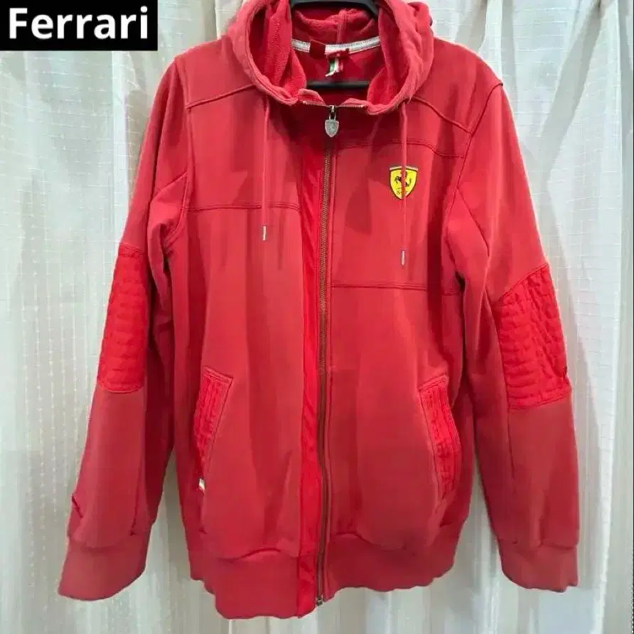 자동 번역되었어요. 원문보기후드 부착된 빨간색 Ferrari 후드티, 말 로고 부착.