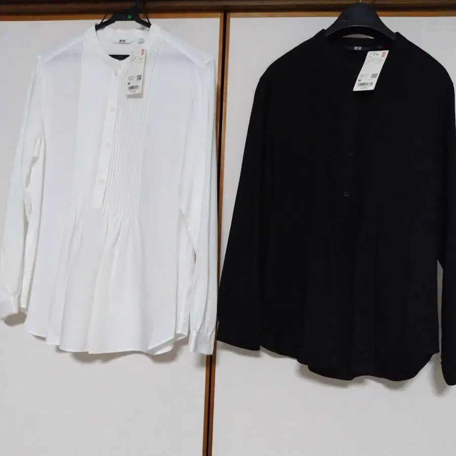 유니클로 긴팔 플리츠 셔츠 화이트 블랙 2장 세트