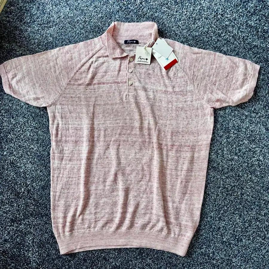 [미사용 택 포함] 파파스 플러스 린넨 100% 니트 피케 셔츠 핑크 L