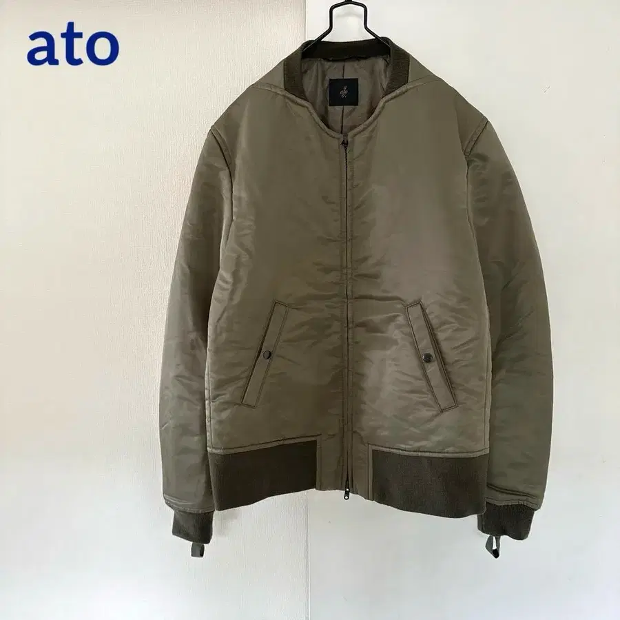 올리브 컬러의 MA-1 스타일 자켓, 나일론 소재로 프론트 포켓이 있습니다.
