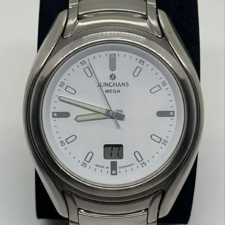 자동 번역되었어요. 원문보기화이트 다이얼의 아날로그, 디지털 표시를 갖춘 JUNGHANS INTEGRAL MEGA 손목시계.
