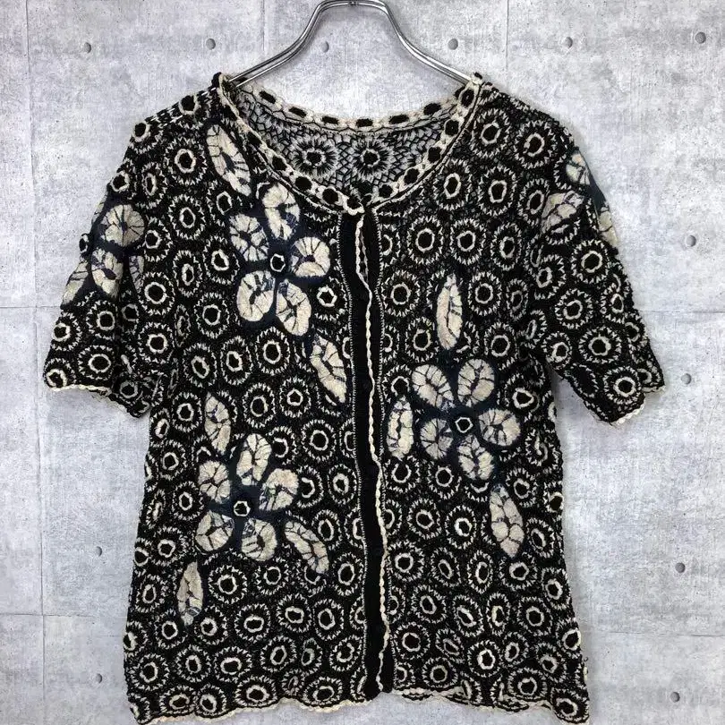 이국적인 꽃무늬 자수 비침 반팔 크로셰 크로쉐 니트 가디건