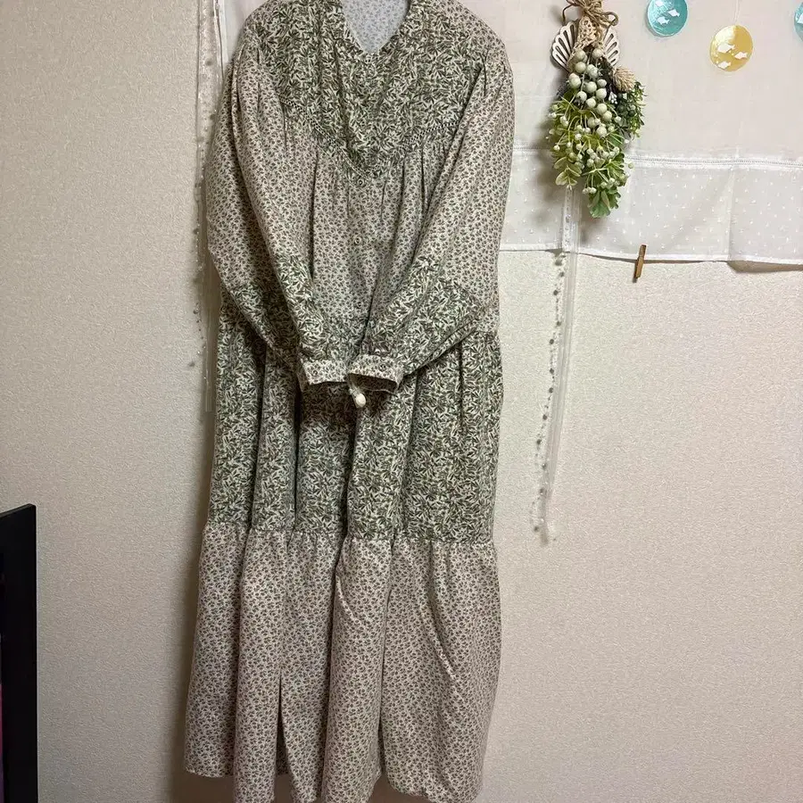 꽃무늬 디자인이 특징인 긴팔 롱 원피스. - 디자인: 꽃무늬 롱 원피스 - 소매: 긴팔 - 색상: 그린 계열과 화이트 계열의 콤비네이션 - 버튼: 앞면에 버튼 있음 - 소재: 부드러운 원단 중고품 주름 있음 총장 116cm 개인 측정입니다. 현재 상태 그대로 전달됩니다. 방문해 주셔서 감사합니다.