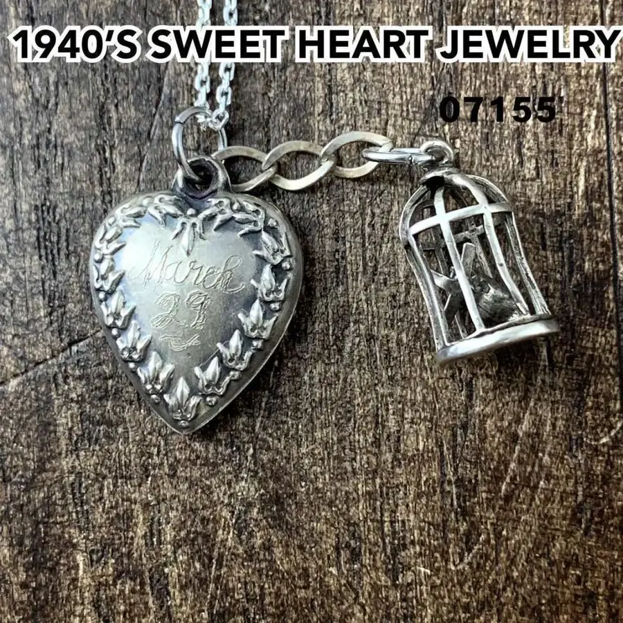 가장자리에 비둘기 발 Pigeon's foot이 그려진 하트 모티브에 새장 참이 달려 있습니다.