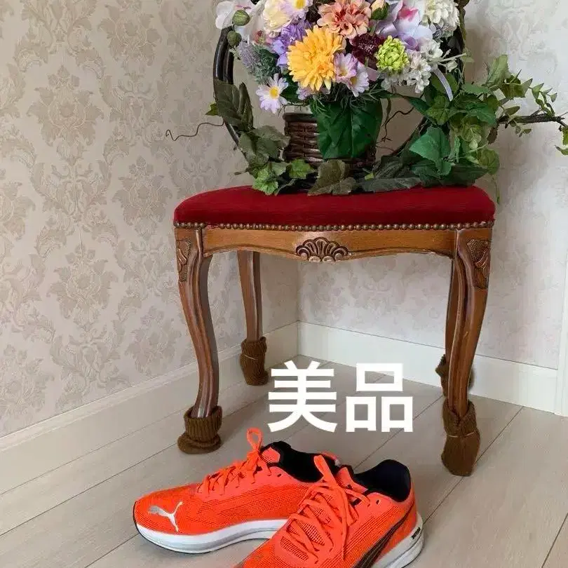 경량으로 반발력이 있는 NITRO 테크놀로지를 탑재한 오렌지색 러닝화. 중학교 아들이 몇 번 신은 정도입니다. 겨울을 넘기자마자 사이즈가 맞지 않게 되었습니다. 꽤 깔끔하다고 생각합니다. 사진 배경의 의자와 꽃은 판매하지 않습니다.