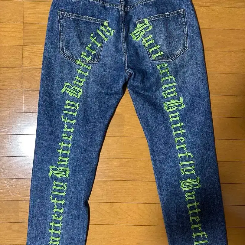 사이즈는 30입니다. 약간 슬림한 실루엣입니다. 선명한 형광 그린의 Butterfly 로고가 특징인 데미지 데님 팬츠. - 디자인: Butterfly 로고가 선명한 형광 그린으로 프린트된 데님 팬츠 - 데미지 가공: 여러 데미지와 리페어 가공이 된 데님 - 색상: 인디고 블루 - 스타일: 스트레이트 레그 - 포켓: 백 포켓 있음. 방문해 주셔서 감사합니다.