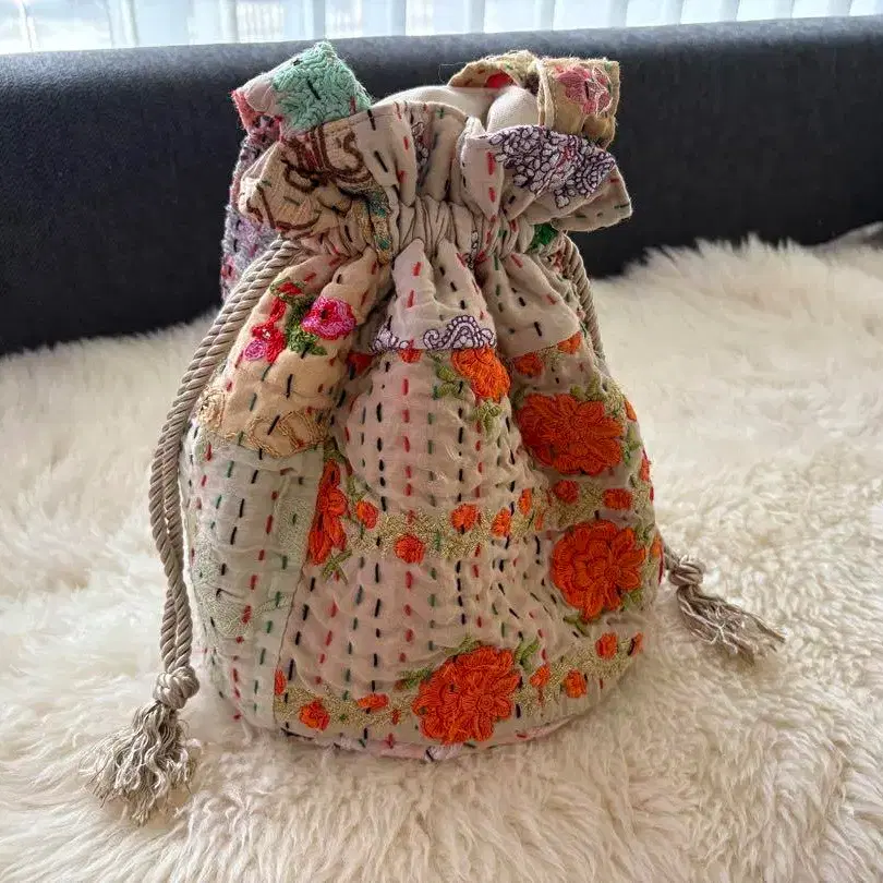 자수가 놓인 베이지색 복조리 백, 내부 포켓이 있어 실용적입니다.