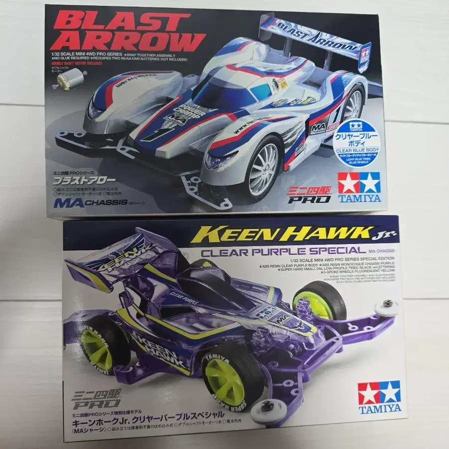 TAMIYA제의 미니 사륜구동, BLAST ARROW와 KEEN HAWK Jr. 세트.