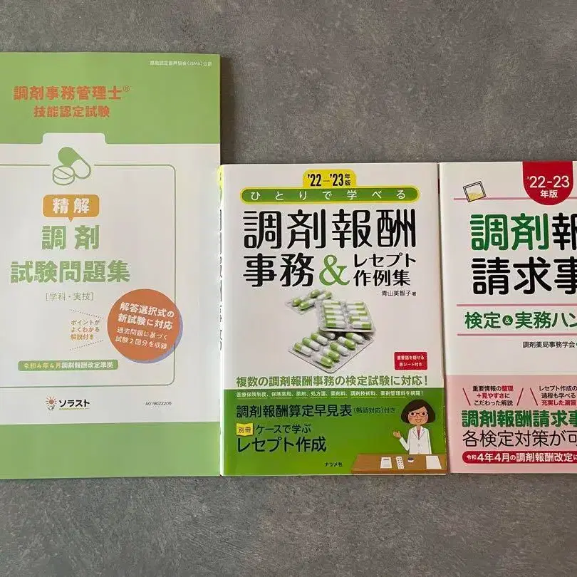 조제 시험에 필요한 문제집과 실무 핸드북 세트. - 타이틀: 조제 시험 문제집 - 출판년: 2022-2023 - 내용: 조제 보수 사무 & 레시피와 작례집 - 내용: 조제 보수 청구 사무 검정 실무 핸드북 방문해 주셔서 감사합니다. 3권 세트로 판매됩니다. 문제집만 별도 판매해 달라는 요청은 접수할 수 없으니 이해해 주시기 바랍니다. 가격 인하 협상도 이 상품은 사양해 주시기 바랍니다. 즉시 구매 가능하며 빨리 구매하는 사람이 임자입니다. 잘 부탁드립니다. 조제 보수 사무 3권 세트 조제 사무 관리사 소라스트 2022-2023