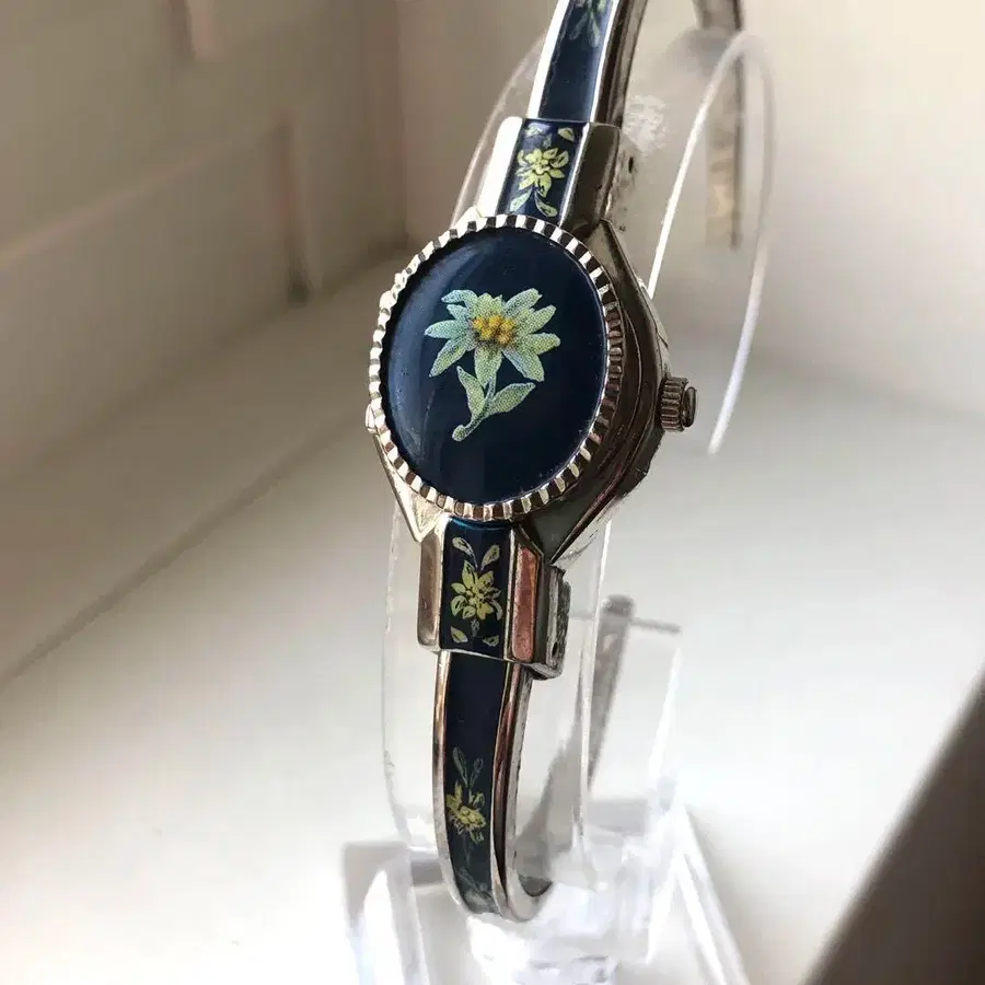 파란색 다이얼에 꽃 에나멜 장식이 더해진 쿼츠 손목시계. - 디자인: 파란색 다이얼에 꽃 에나멜 장식 - 밴드 소재: 금속제 밴드 - 기능: 쿼츠식 손목시계 방문해 주셔서 감사합니다.