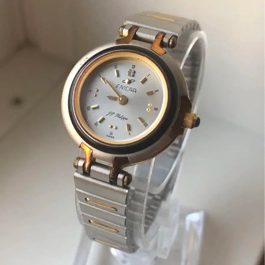 실버와 골드의 콤비네이션이 특징인 ENICAR의 아날로그 쿼츠 손목시계. - 브랜드: ENICAR - 색상: 실버/골드 - 소재: 스테인리스 스틸 - 디자인: 아날로그 표시 - 특징: 파란색 보석이 박힌 크라운 방문해 주셔서 감사합니다.