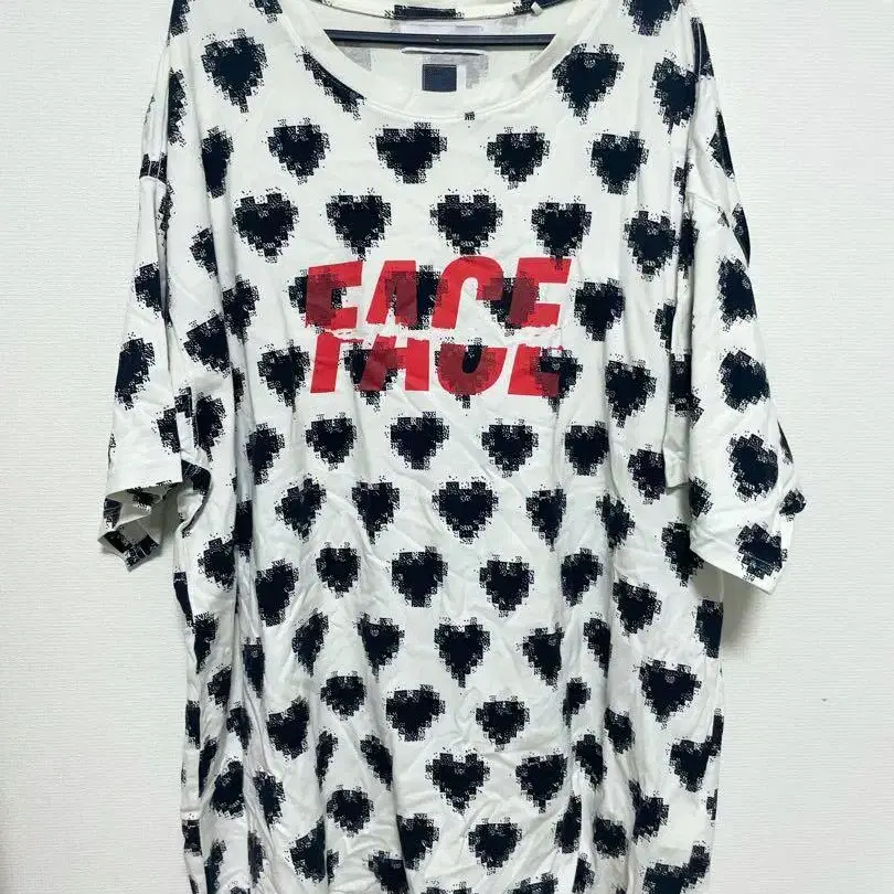 남성용 여성용 모두 착용 가능 목 부분이 약간 늘어났습니다. 이미지 3번째 사이즈는 원사이즈입니다. (대략 M 사이즈) - 디자인: 하트 무늬 (블랙) - 색상: 화이트 - 텍스트: FACE (빨간색) - 스타일: 오버 사이즈 - 소매: 반팔 방문해 주셔서 감사합니다. 색상 - 화이트 계열 패턴 디자인 - 기타